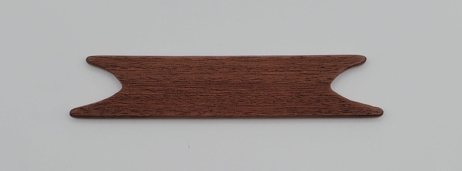 A compact sapele shuttle designed for smooth, easy weaving. Finished with a durable clear coat. These 5" shuttles have two opening styles: a simple open notch or a Enclosed curved slot opening. Ideal for inkle looms, band weaving, and other belt-style looms.