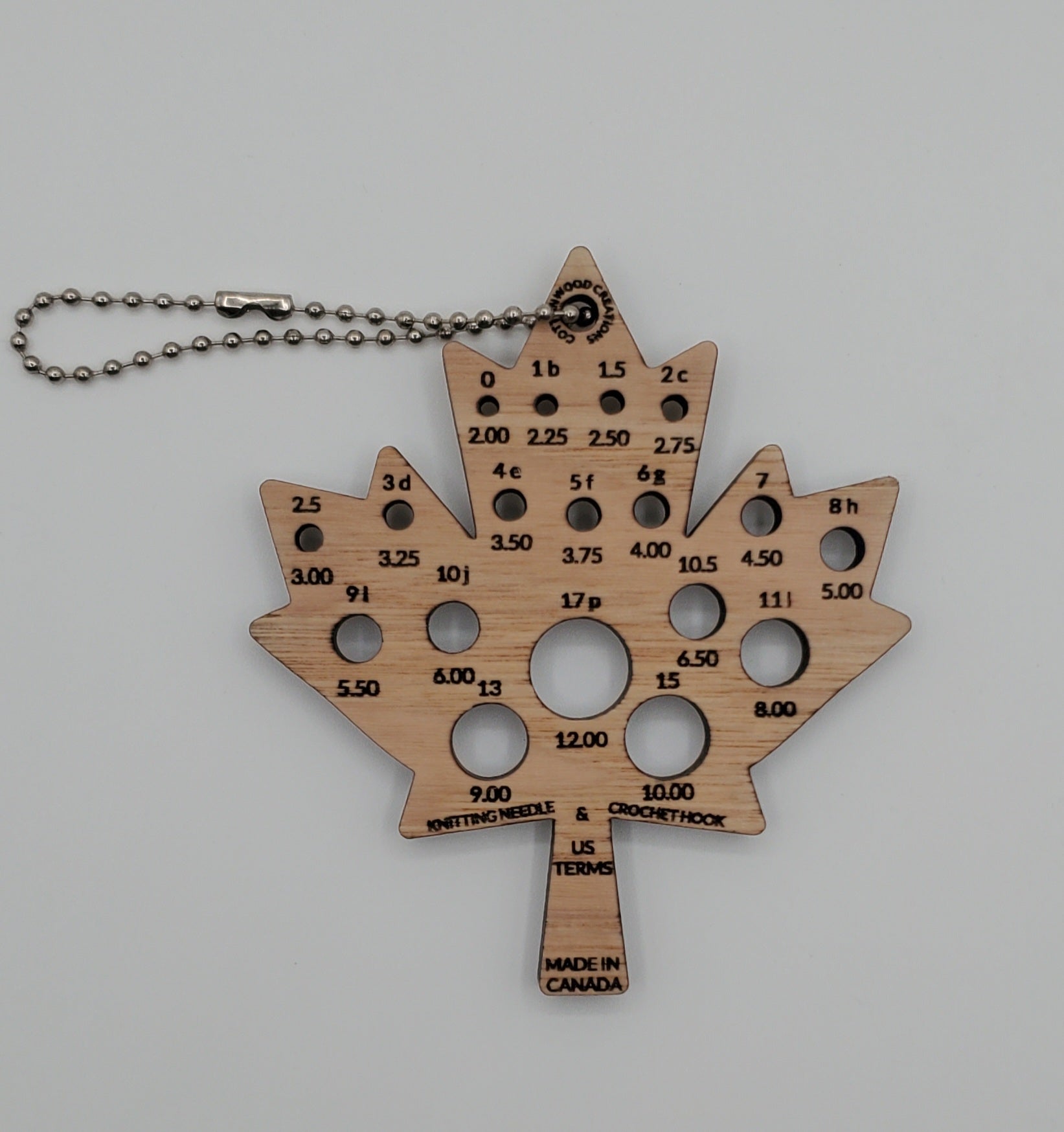 A touch of Canada for your project bag! This maple leaf–shaped gauge helps you quickly identify knitting needle and crochet hook sizes with precision and style. Made from smooth, durable wood, it’s both a practical tool and a charming keepsake for any fibre crafter.